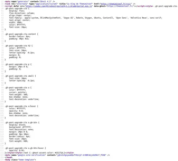 Après plusieurs recherches dans le code source de Ghost et du thème Casper, je trouve le moyen de désactiver l’injection de ce bout de code. La suite de cet article vous permettra de les éradiquer de votre site. Toutefois, il sera impossible de masquer ses fonctionnalités dans l’interface d’administration de Ghost.
