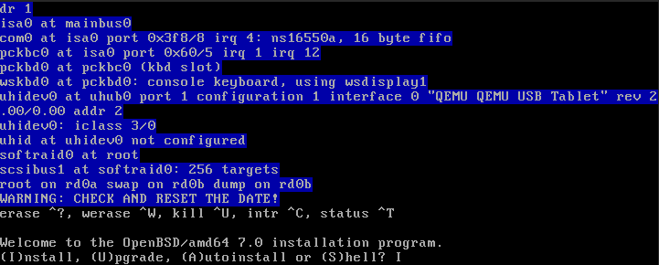 Avec un peu de persévérance, la console d’urgence commencera à afficher des choses. Si tout va bien, on aperçoit le Kernel OpenBSD démarrer et à partir d’un certain moment, on aperçoit le message «* Welcome to the OpenBSD/amd64 7.0 installation program. *». Première victoire ! 🎉