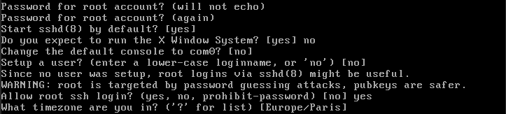 Lors de la configuration de l’utilisateur, je spécifie un mot de passe pour l’utilisateur root, je lui dis que sshd soit démarrer comme un grand, que je ne souhaite pas faire tourner XOrg et que j’autorise la connexion par mot de passe pour l’utilisateur root (à passer en prohibit-password une fois une clé SSH provisionnée !).
