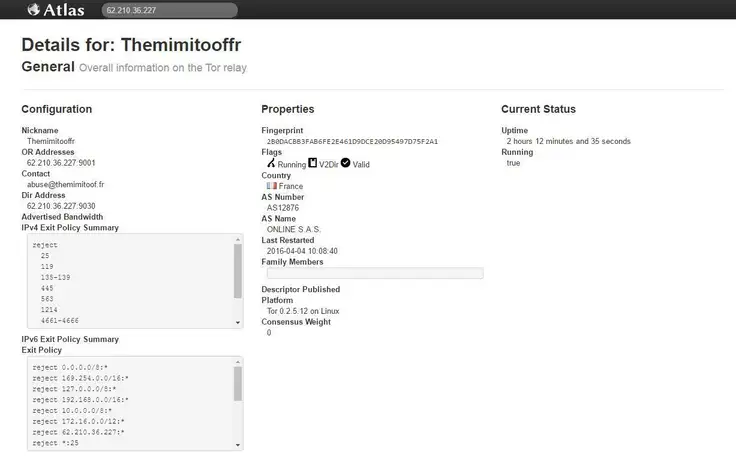 Vous pouvez aussi vérifier sur Atlas en y mettant l’adresse IP de votre relais dans la barre de recherche pour récupérer l’état de votre relais ainsi que toutes les informations et des statistiques sur la bande passante utilisé.