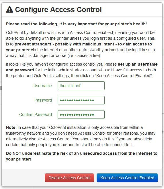 Après 30 minutes/1 heure d’installation, nous voilà enfin prêt à découvrir l’interface d’OctoPrint ! Lancez votre navigateur web et tapez l’adresse : http://<ip_octoprint>:5000. On nous demande dans un premier temps si l’on souhaite créer le premier utilisateur qui possédera tous les droits. Mais sachez qu’il est possible de refuser mais niveau sécurité… bah il n’y a plus rien 🙁