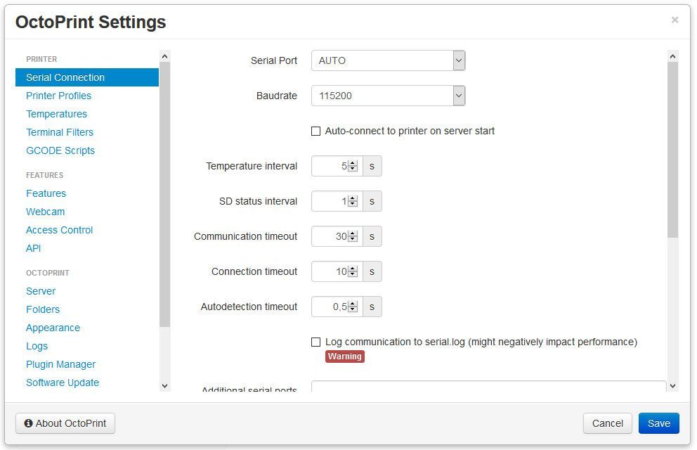 Dans les paramètres de configuration, nous allons modifier quelques paramètres importants. Le premier permet de dire au logiciel sur quelle interface série et le baudrate faut-il utiliser pour se connecter à l’imprimante. La majeure partie des imprimantes utilisent le baudrate 115200.