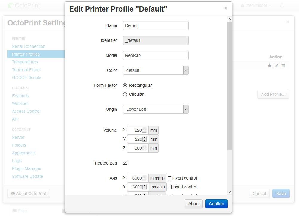 Ensuite vous devrez modifier le profil par défaut ou créer un nouveau profil pour votre imprimante avec toutes les informations techniques comme la taille d’impression, la vitesse de chaque axe, la forme de votre imprimante, etc…