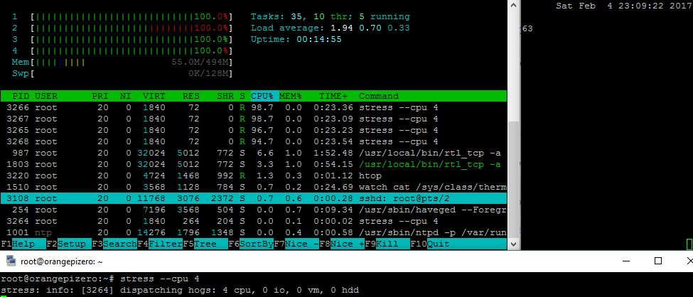 J’ai remarqué que l’Orange Pi Zero (et le boitier) étaient très très chauds même si le RTL-2832U n’était pas en cours d’utilisation. L’OS m’affichait plus de 80°C pour le pauvre H2+ … Une des conséquences qui explique cela est l’énergie consommé par les modules externes et la carte elle-même. L’ampère mettre affiche 840mA avec les modules tandis qu’à vide, l’ampère mettre affiche 34mA pour une température de 32°C…