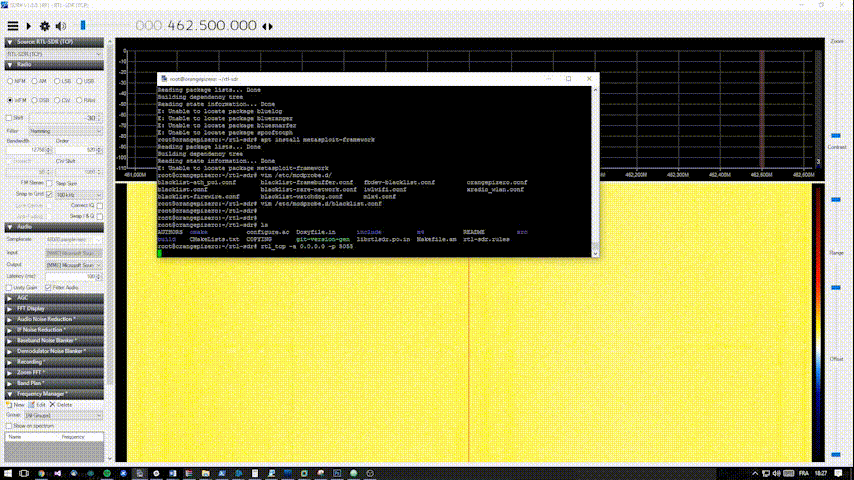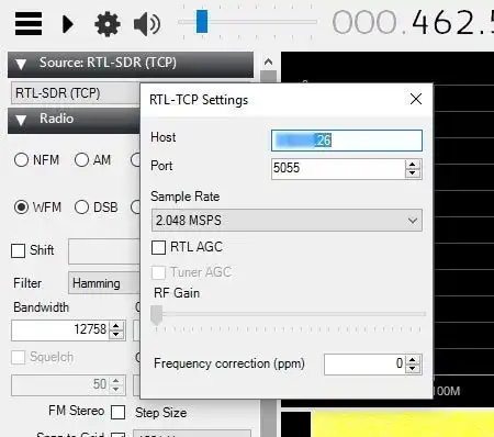 Un petit redémarrage du système s’impose et c’est parti pour tester si rtl_tcp fonctionne correctement. Pour cela, j’utilise la commande rtl_tcp -a 0.0.0.0 -p 5055 (je lance le serveur qui bind sur 0.0.0.0 et écoute sur le port 5055), je lance un client (SDRSharp dans l’exemple), et je sélectionne la source : RTL-SDR (tcp)